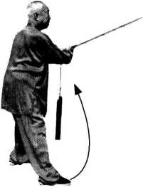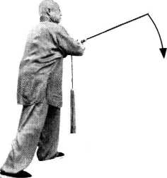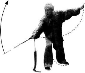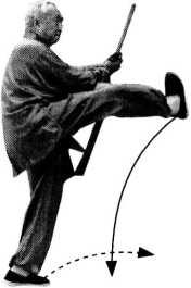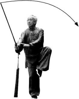 【要点】本动中用了吴式剑特有的平点 佥L微提右腕,用剑尖向左膝前平点剑。