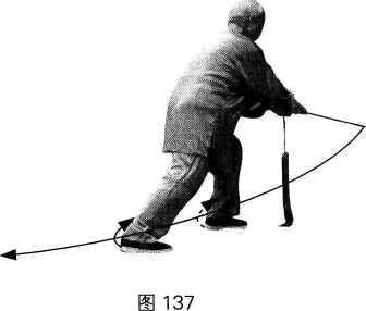 图138图138【要点】从上动的左侧弓步转换到此动的右隅弓步时,应在重心高度不变的状态下, 随重心的右移,完成步型的转换。