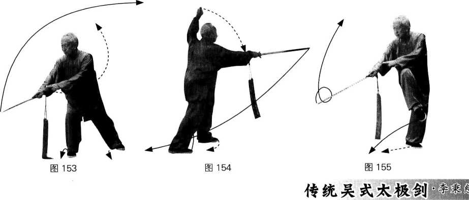 重心下踞,左脚尖内扣(约90。),收折右胯,右膝向左胸前上提,同时向右转体约 180°;右手剑下落,臂内旋,用前下刃平剑向右腿外侧下截,手心朝下,腕与左膝同 高;左手剑指下落,附于右前臂,手心朝下;胸向西南,目视剑尖。(图155)