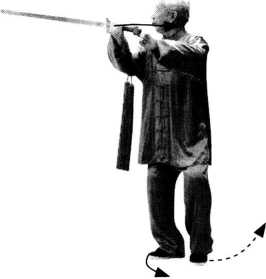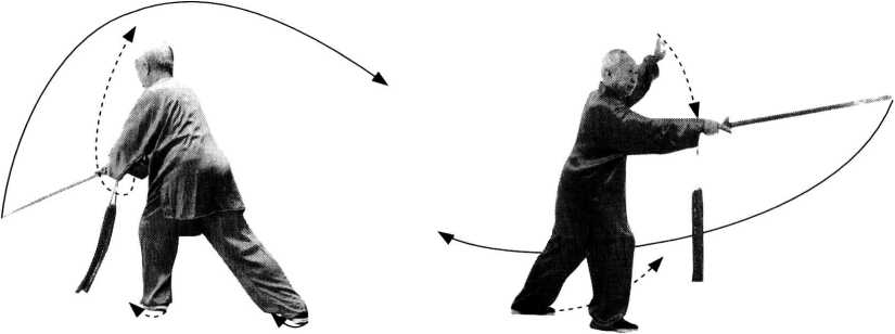 【要点】①胸向从东北转向西南,要求充分收折右胯,同时右膝要向胸前上提,剑 向右下截。②意松下踞,神领剑动,神意、动剑相合。