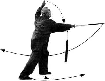 沉肘,经腰间向左上方划弧,臂呈弧形举于头上方,