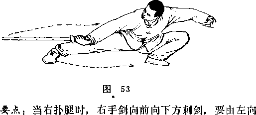 接上动,右脚踏实,身体重心在右腿;右脚掌碾地,使 身体向右后转;左腿随转体由前向后撤步,然后左腿屈膝下 蹲;右腿当上体由面向东转为面向西时(左腿屈蹲),右腿 要扑腿;右手持剑由后随转体向前下方剌出;左手剑指附于 左额旁;眼看剑尖。(图53)