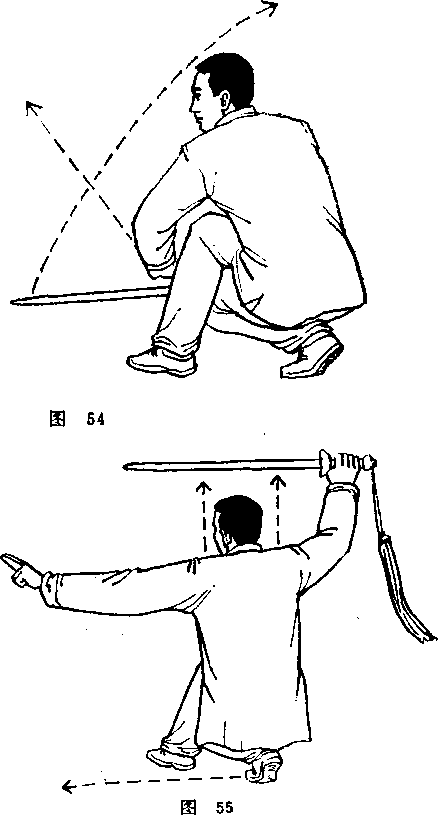 (1 )接上动,右腿向后撤半步盖在左膝上,左膝向右 膝后移动成歇步式:右手持剑由前向后提,置于左额旁,剑 身要平,剑尖向前;左手剑指向前指出;眼视剑尖。(图 54、图 55)