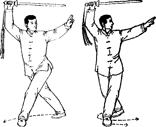 (2 )左脚提起向前上步(脚掌踏地后全脚踏实),左脚 踏实后,身体重心到左腿;右脚向左脚前横落扣步,踏实后重 心移至右腿;这样左、右脚交替左转弯走圈,共走八步;右 手持剑和左手剑指方向不变;眼看剑尖。(图56、图57)