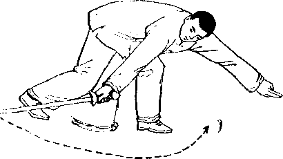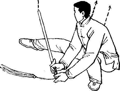 上身稍向下低,随撤左 腿,向左向后转体,左脚在 左后落步踏实,身体重心移 到左腿;左手经左膝搂过; 右腿向前上一步,随即右手 持剑由下向前捞起;眼看 剑.(图79)