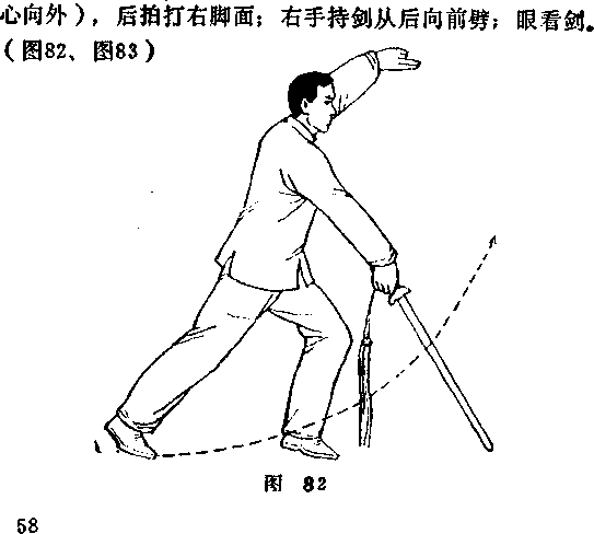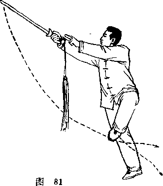 上体向右后转,左腿向后撤;右手持剑随转体向左侧 带;左手剑指变掌附于剑把处;随即左腿屈蹲,右腿扑腿向 前;右脚踏实独立起,左腿提膝脚尖自然下垂,附于右腿后 侧;右手持剑向斜上方刺,左掌附在剑把后边向上托;然后 左腿屈蹲,右腿仍扑腿;再反复右腿独立,左腿附于右腿后 提膝;右手持剑和左手托剑再上刺;眼看剑尖.(图80、 图81 )