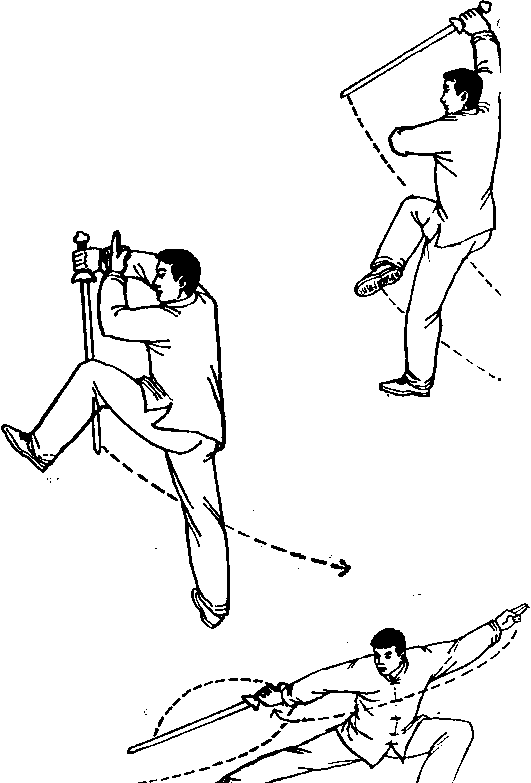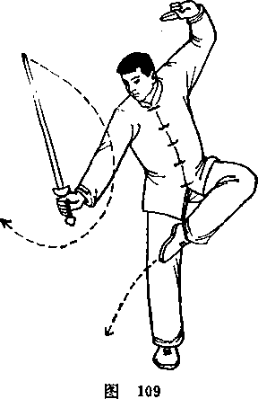 左腿屈膝独立;右手持剑从 前往后向上抡起,左手剑指从前向后 再向上附于左额旁;右腿向前上半步 踏实屈膝独立;左腿提膝,脚尖自然 下垂;右手持剑继续向右前方劈出; 眼看剑刃.(图109 )