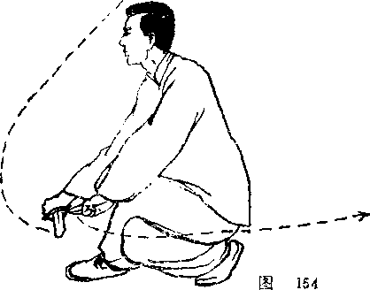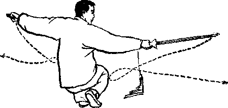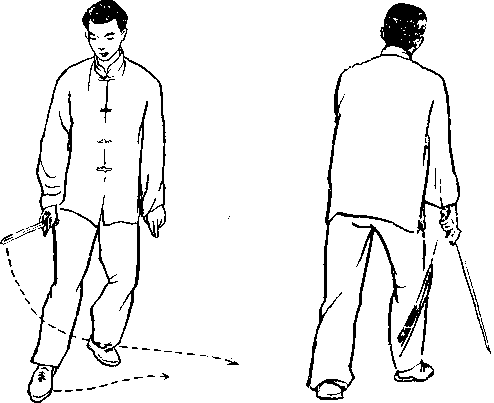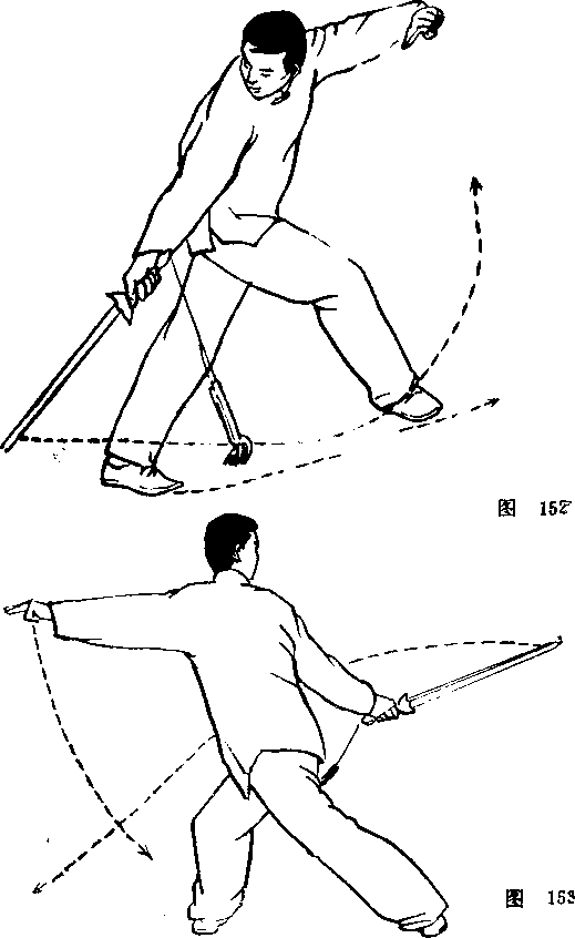 上体稍右转,右脚踏实,左腿跳起、右腿随即提膝跳 起;左脚先落地踏实,右脚后落地(脚掌踏地)在左脚前落 步时,右手持剑在体右侧划立圆,然后向前下方刺出,左手 在体左侧划立圆向前下方指出;眼看剑尖。(图150、图151)