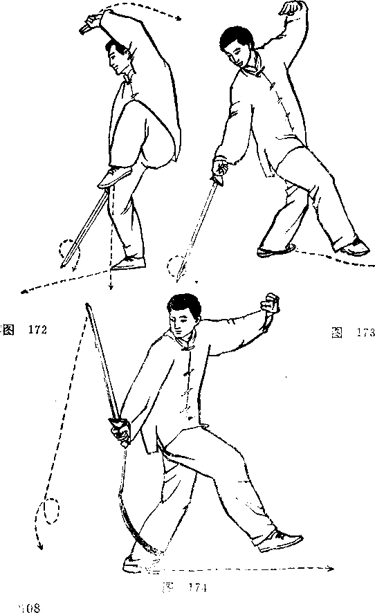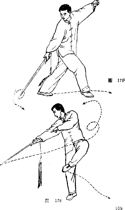 上体稍后移,左腿屈膝站稳,右腿提膝向前上步;右手 持剑向右前下方点剑,左手剑指附于左额旁手心向外,左腿 提膝向前上步;右手持剑仍向右前下方点剑,左手剑指随上 步划弧附在左额旁;当右腿提膝再向前上步的同时,右手提 剑从下向上向左弧形抹起,左手剑指仍附左额旁;眼看剑, 刃.(图 ”2、图 173、图 174、图 175、图 176)卖点:每左右脚上步着地时,都向下点剑.当向上提剑 抹剑时,要以腰带动.