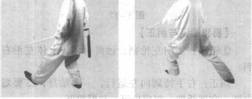 ① 身体向左后转体时,要先提左腿,上体正直, 头顶悬,右腿不能直挺,要膝部微屈,脚跟用力, 利用左转的惯性,才能转体灵活、平稳。