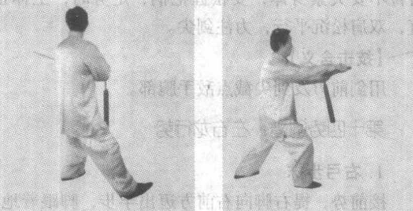 接前势,提右脚向右前方迈出半步,脚跟着地, 重心在左腿,成右虚步;右手持剑,臂内旋稍向内 收引',剑身斜置于体前,剑柄高与右肋平,剑尖朝 东北;左剑指仍附于右腕处。(图5-41)