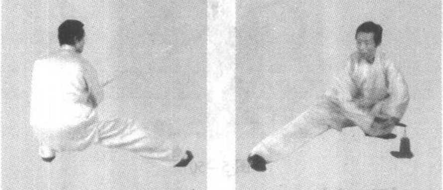 左侧仆步回抽剑与左剑指,要先开展后合拢, 上体正直,立腰、松肩,方向为正东。