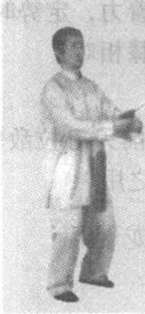 纠正:左脚尖换成脚跟着地,上体正直,两脚 距离一脚宽;剑由外向内卷收至腰间,剑尖始终朝