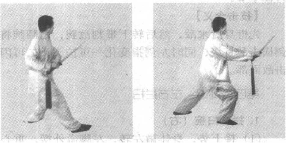 (1)接上势,身体微左转,左脚微外摆,重心 稳于左腿,右脚提起经左脚内侧向前迈步,脚跟着 地,成左虚步;同时,右手持剑,臂内旋屈臂回收 拦扫至胸前,剑尖斜向左前方,手心向下,左手剑 指附于右腕部,眼看剑尖台(图5-13)
