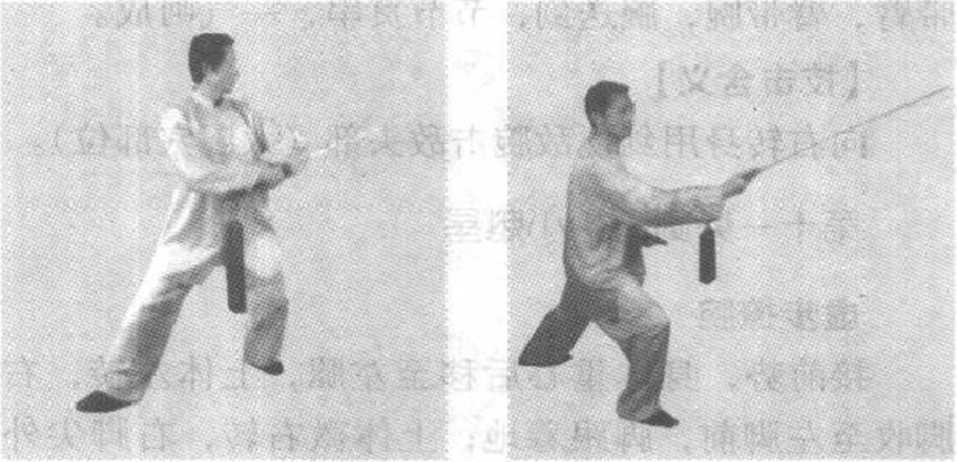 纠正:右脚迈步,先碾步收于左脚前再迈步. 要轻灵稳重;右手持剑反手崩剑.要握活把.用肘 带臂,臂带腕,腕送剑,节节贯串,一气呵成①