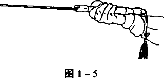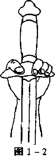 平剑(刃朝左右r拇指和食指贴靠护手,其余 两指并拢握紧剑柄,多用于刺剑等口(图1-5)