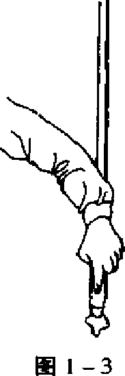 平剑(刃朝左右),手心向下,拇指、食指和虎 口钳夹,其余三指松握剑柄,多用于抹剑、撩剑。 (图 1-6)