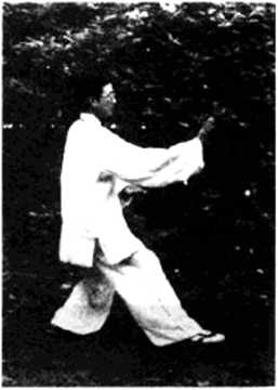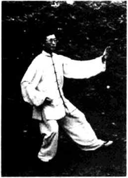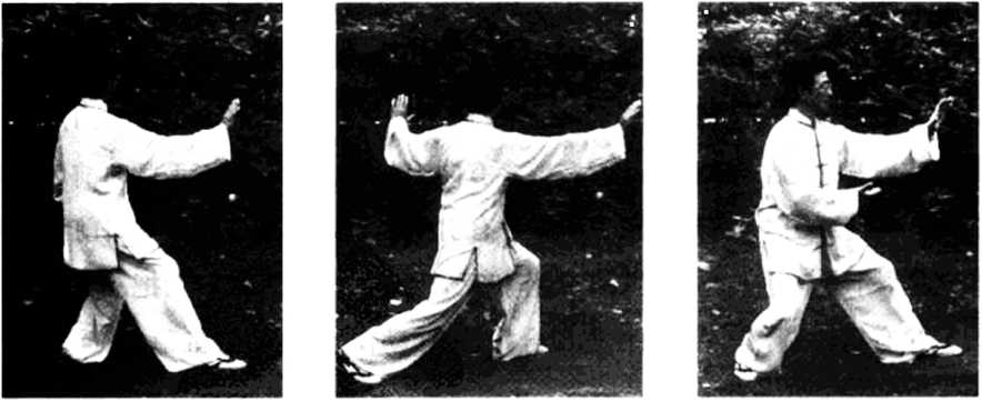 接上式,身体微向左转,重心在左腿,左掌向下、向后落至左鼬旁,掌心 向上,掌指向前;右脚跟着地,眼随身体转动向前平视(图13.1)0 【动作要领】
