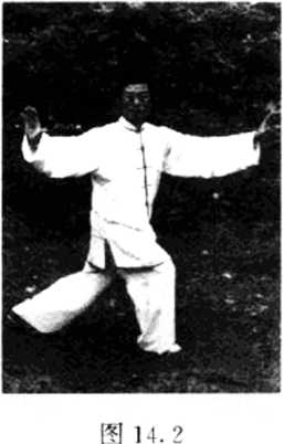 身体继续微向左转,右脚提起向后撤步,先以脚前掌踏地;同时左掌从 髓旁向左后上方划弧,掌心向外,腕与肩平,掌指向上;右掌随身体转动向前 微展,掌心向前,掌指向上;眼随之向前平视(图13.2)。