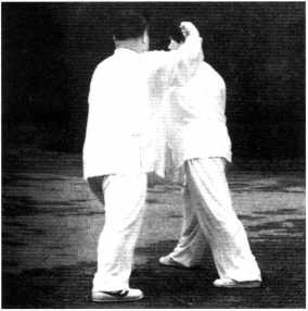 如对手从我左前方,用左 手打来,我即将左脚往后斜踏 出,成左弓步,两手同时荡拳 落随往左合,即用右掌将对手 左腕扼住,往左侧下采,移到 与心部相对,左拳由左外翻 上,转到左额角旁,拳心向外, 急向对手头部打去,或用右拳 击对手背部。此式以退为进, 忽开抱合意含凶猛。