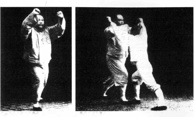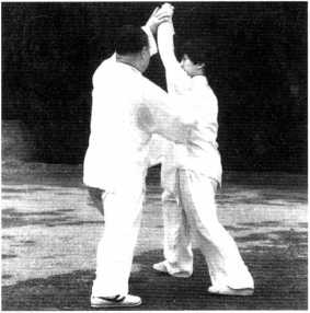 如甲乙二人靠右手时,甲 左手扣住乙右手腕上按下,举 右拳要打乙项,为右打虎式, 右足弓式,左足蹬直。如甲右 手扣住乙左手腕,甲举左拳要 打乙项,左足弓式,右足为直 线,为左打虎式。