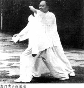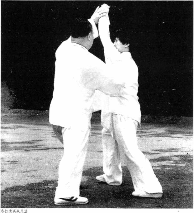 右打虎式:设敌人以右脚 在前,用右拳向我右背击来, 我急转左脚尖,并转身用右手 接住敌人右拳粘住,同时将右 脚提起,向右侧踏出半步,屈 膝坐实,随用左手扣住故人右 肘,向右侧采下,同时右手握 拳翻上,手背向外在故人耳后 或右肩上击去。左打虎式用法 相同。