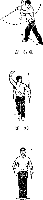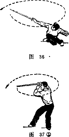 1右脚蹬地两腿伸直站起并以两脚的前脚掌碾地使上身向左后转转身之后右胭屈膝咯蹲右脚踏实左膝微屈前脚掌虚着地面身体重心落于右腿同时右手持剑随身体转动一周后屈肘使剑平举拇指一恻在下手此时左手剑指附于右手腕处』目视剑尖(图37之1)中