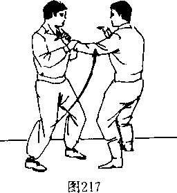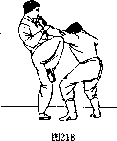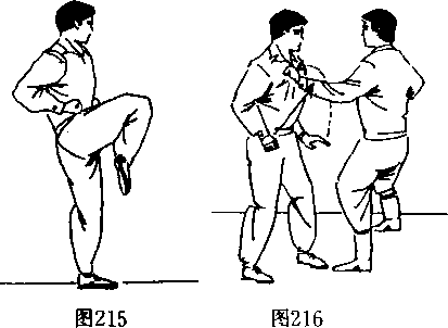 提 腿——为“提皇腿”,即将一腿屈膝提起,以扣膝护 裆。或以提腿借机用膝撞击敌方,可防可攻。主要有4种:提 皇腿、提皇点腿、提皇踹腿、侧撞膝。(十)提皇腿一腿直立,另一腿屈膝提腿,高与胸齐。(图215)【例】若我方站立,敌方进身出左手来抓我胸口。我则迅 速出双手抓握住敌手,同时左脚直立,右脚提膝猛然向上顶撞 击敌左手肘部。(图216、217、218)