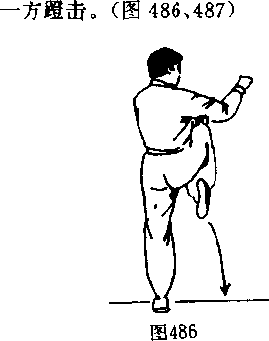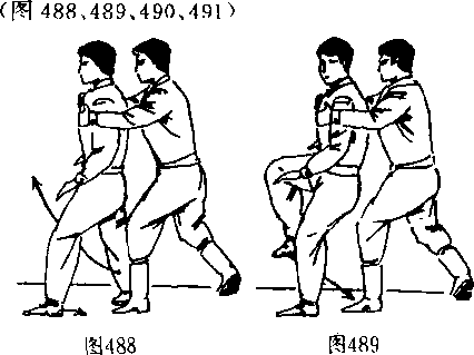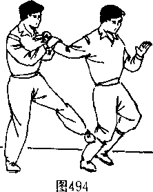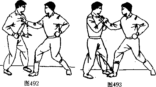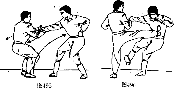 1例3)若敌出右手向我抓或击来,我立即出双手向上 反抓握其手,身体下沉,带手向左后拽拉,逼迫敌方向前进身; 随即身体挺立,左腿直立,出右腿向右上方直腿蹬击敌腹部。 (图 495,496)