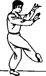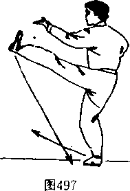 右腿微屈站立,左脚尖勾起朝向左上,向右前撇腿蹬击, 脚与右膝平。同时两手屈肘向内,随即向下、向两侧伸臂击拳, 小臂内旋,拳心朝后,高与腰平。(图503)