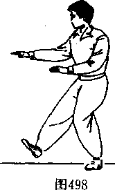 然后,左脚落地,左臂内旋,双手翻掌向前下方按出,与腹 高。左腿屈膝微蹲,右脚跟擦地向前踢出或顶腿,脚跟稍离地。 (图 498)
