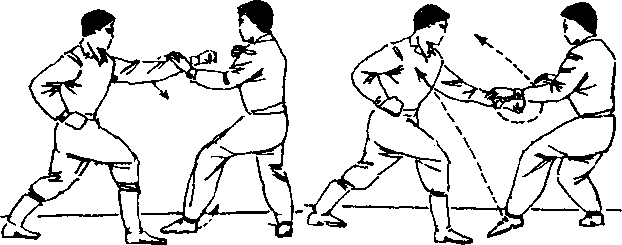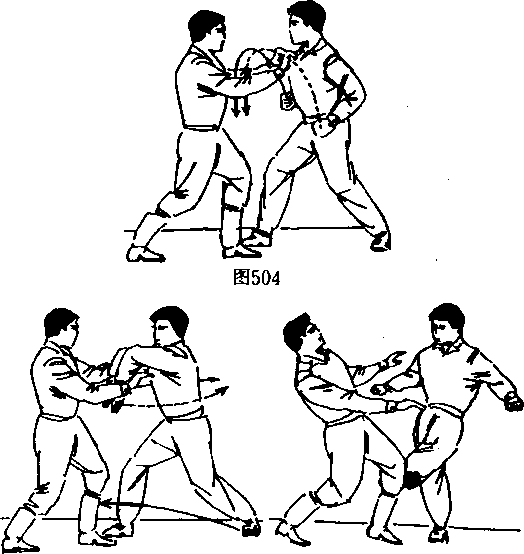 【例21我方站立,敌方上步进身,出双手来抓我胸口, 我立即双手屈肘,向上、向内、再向下,从敌双手间穿过,再握 '拳向两便I分化敌双手,同时右腿微屈站立,提左腿脚尖外展, 、徽腿向前蹬击敌前腿膝部,以解危制敌。(图504.505,506)