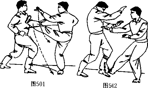 1例11敌左我右,敌上步出左拳击我胸,我迅速出左 手拦截,粘持敌手向内拉带,缩身收左腿,以脚尖点地。(图 499.500)随即乘敌刚欲收拳之势,右腿屈膝站立,提左腿向 前上方揪脚蹬击敌胸部。(图501)然后,我迅速落而收回左 脚,双手翻掌下按敌腹,同时出右脚脚尖上勾,向前顶腿蹬击 敌前腿胫骨。(图502)