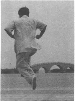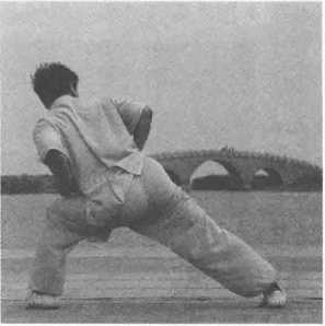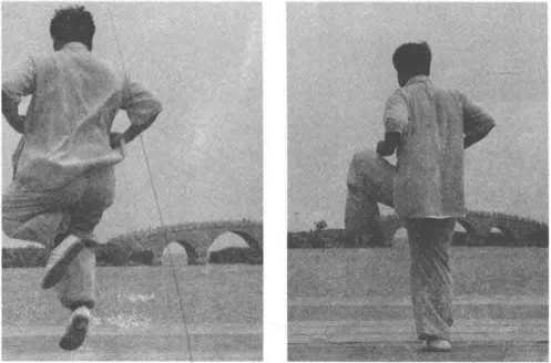右腿向左腿左侧跳半步,左腿同时向左前方跳跃,两拳握于舫中,拳心向上,目 视前方。(图 4一83、图 4—84、图 4—85、图 4-86 )