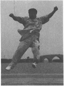 接上式,身体直立,上身右倾,左腿腾空外摆腿,右腿同时起腿做腾空里合腿. 身体转体360度,双脚落地.上动不停,右掌自下向上迎击,左掌自上向下拍击右掌 掌背部,击拍要响,两手分开;腾空时,左手掌击拍右脚脚掌,击拍要响,目视空中 击拍处(图 4-93、图 4-94、图 4—95、图 4-96、图 4-97 图 4-98、图 4一99、图 4-100)