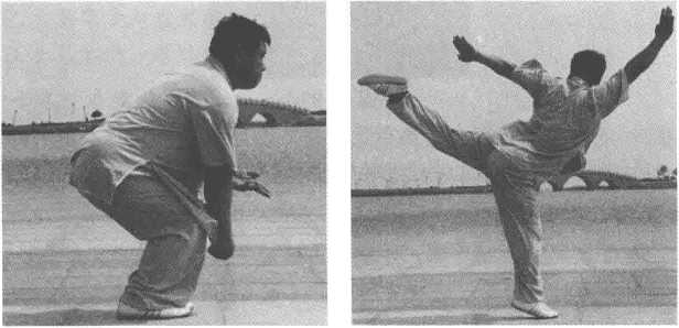 身体直起,右腿挺膝蹬直,左腿后挑,脚面绷直,力达脚掌,右手变掌,两手同 时前后上挑,目视后脚掌“(图6-84、图6-85)