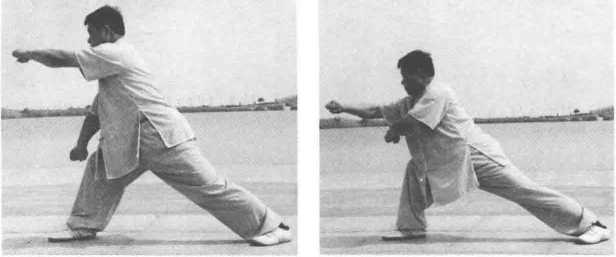 身体右转,接上式。左拳向下抱于腹部,左拳自肋中向上迎击,左脚挺膝蹬直身 体成右弓步。同时,上动不停,左、右拳在身体前方胸前旋转,拳心向下,右拳篷出, 左拳置于胸前,目视右拳面。(图6-90、图6-91)