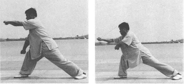 身体右转,接上式。左拳向下抱于腹部,左拳自肋中向上迎击,左脚挺膝蹬直, 身体成右弓步。同时,上动不停,左、右拳在身体前方胸前旋转,拳心向下,右拳篷出, 左拳置于胸前,目视右拳面。(图7-69、图7-70)