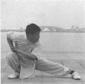 接上式。右臂屈肘回抽,右拳回收于右肋,拳心向上,上动不停,身体重心下移, 右腿屈膝下蹲,左腿挺膝伸直,平铺地面,全脚掌着地,左脚尖内扣成左仆步,上身 挺胸抬头,向左摆头,左手变掌,直接立于右胸前,目视左侧。(图7-71)