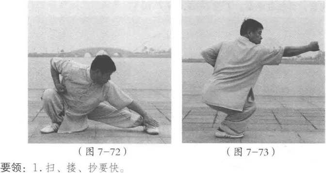 接上式.动作不停,左手掌心朝下,由右肋向下方裆部,顺左腿方向到左脚扫、搂、 抄变拳回到左肋,拳心向上,同时,右脚上步振脚,身体下蹲,右拳从身体右肋向前 立拳击出,目视右拳。(图7-72、图7-73)