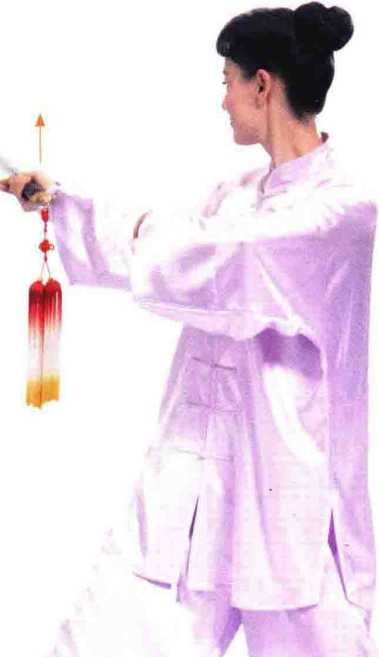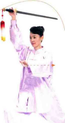 重心前程,同时,右手剑上举, 剑尖斜向后下方。左剑指平 摆,在右肩前,眼看前方。