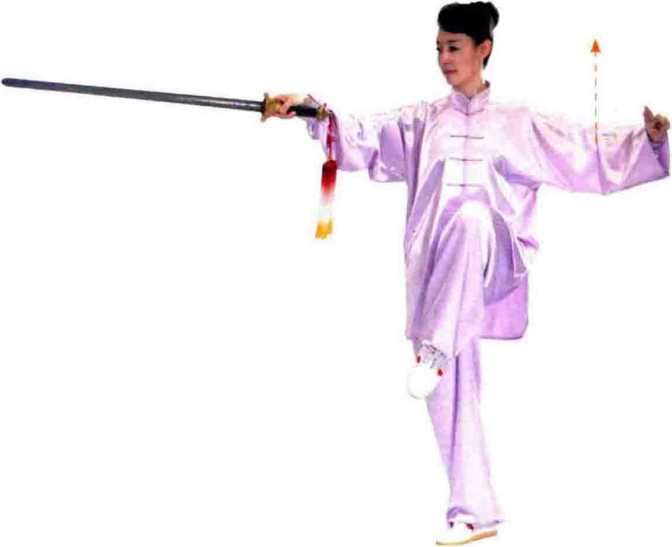 左腿提起,成右独立步,同时, 右手剑平劈,高与肩平。左 剑指侧撑与肩平,眼看剑尖。
