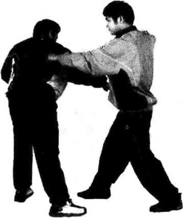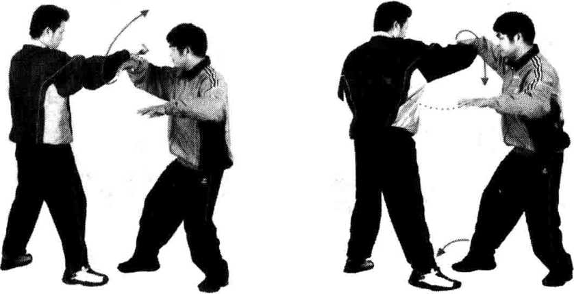 敌用右直拳向我击来,我迅速以右臂架挡敌右小臂;然后, 右脚向右前垫半步,在我上身右转的同时,降低身体重心,并使 手腕内旋,以小臂内侧向后方拨挂敌右臂,将对方牵动到我右侧 之时,左手以崩拳之势猛击敌背部(图75、76、77)。