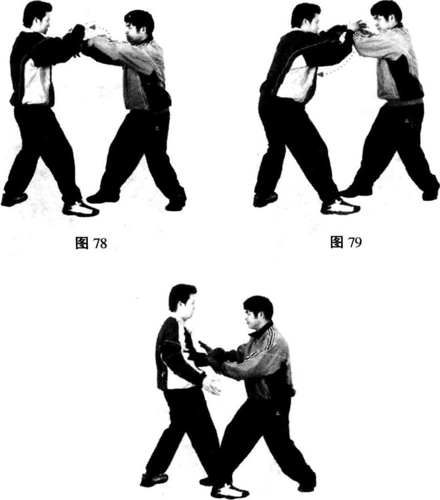 敌用两拳由上往下向我砸来,我稍向后闪身,并同时以两小 臂接敌两手腕部;然后,以我两腕及指根部位向上、再向右后方 撑挂敌方两臂,使敌受震动而失去重心,我则突然双掌回转,向 前下方劈打对方胸部(图78、79、80) o