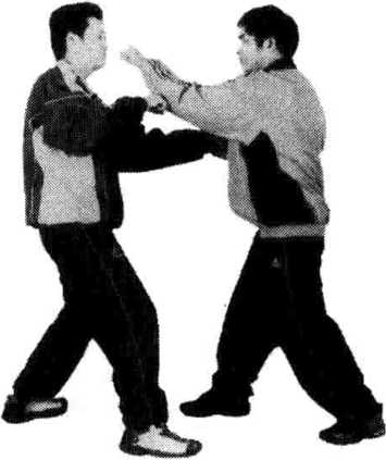 当敌用左直拳向我头面部击来时,我稍向后闪身,迅速以我 两臂相迎,在我胯向后坐、身向右转的同时,以两臂外侧分别向 外磕击敌左右小臂,将其双臂分挡后,我突然上身左转,将左掌 变拳以炮拳之势击敌面部(图81、82、83)。