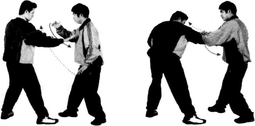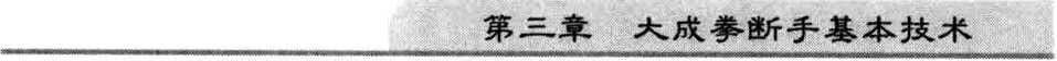 当敌用右掌向我胸部推来时,我稍含胸,并以右手抓敌右 掌,向内折拿,左手托按敌右肘;然后,胯向后坐,身向右转, 两手同时向右拉拿敌右肘,使敌关节受制向后挣扎;待敌起身 后,我迅速使上身向左回转,左掌以削掌之势猛力砍击敌颈部 (图 84、85、86) o