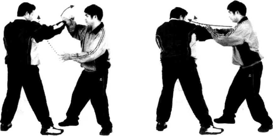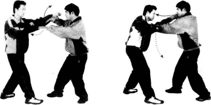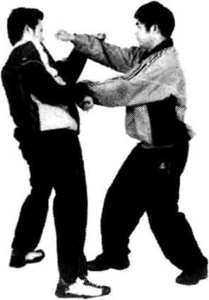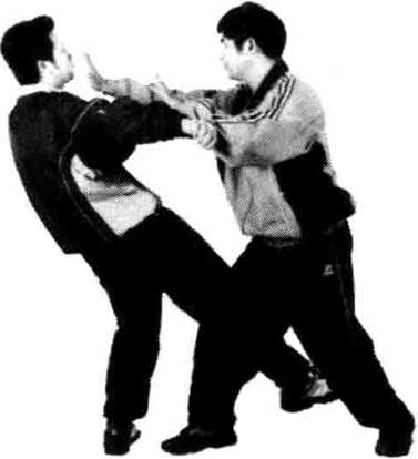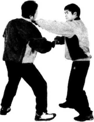 当敌用左直拳向我击来时,我稍向左闪身,同时,以我右臂 向右磕挡敌左小臂;然后,右手腕外旋,以右掌用力抓握敌左小 臂内侧,左手扣按敌左肩部位;继之,两手同时向右后方旋挂敌 上体,迫敌重心不稳或向后挣扎,我迅速将左右两手变拳分别迎 面击打敌胸部与面部(图87、88、89)o