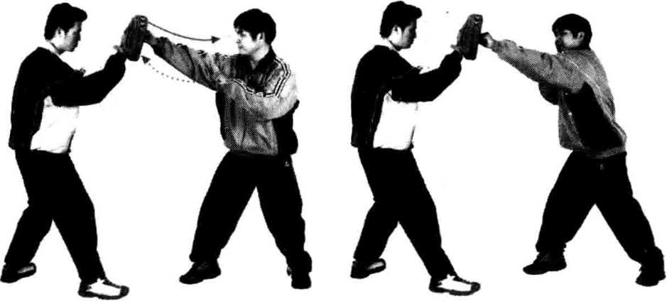 为了打得中,平时可进行击靶、打拳套的训练,让一拳友配 戴拳套或手靶,位于我身前一定距离处,我以此为攻击目标,用 不同的技法打击之。