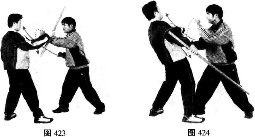 敌右手举棍由上往下向我头部击来时,我迅速向右闪身,以 左腕迎敌右臂,将其向左拨按,同时右拳击敌面部;继之,我左 手沿敌右小臂滑至肘窝处,五指扣按敌肘部内侧肌肉,将其右臂 卡住,待我右拳回收后,再使左脚上步,以右拳击敌面部。(图 423、 424、 425)