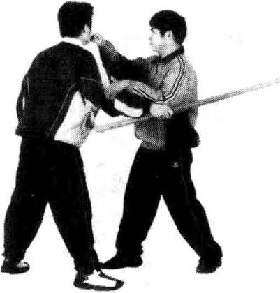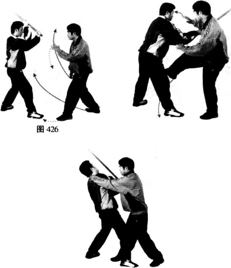敌双手握棍从上向下砸我头部时,我左脚向左前方迈一大 步,上身随之左闪;同时,右脚以足尖部位弹踢敌裆部,当我右 脚落地后,左掌从敌背后击敌颈项部位,右掌由下向上击敌咽喉 部位,两掌合击后紧卡敌颈部,使敌无反抗之力。(图426、427、 428)